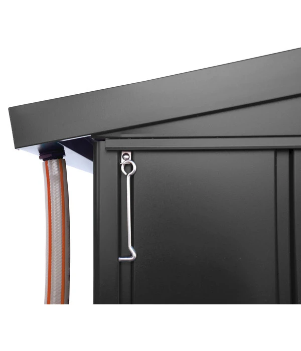 Werkzeuge, Gartengeräte & Co. finden im Gerätehaus Europa 2a von Biohort garantiert ihren Platz. Feuerverzinkte, polyamid-einbrennlackierte Stahlblech-Elemente und eine umfangreiche Grundausstattung zeichnen das Europa 5 aus. Mitgeliefert werden vier Halter für Gartengeräte, zwei Regale sowie ein Ordnungssystem, in dem Sie viele Utensilien für den Garten unterbringen können. Ein Regenrinnen-Set und eine Flügeltür mit Drehgriff-Zylinderschloss sind ebenfalls inklusive. Das Gerätehaus Europa 2a besitzt eine geräumige Doppeltür mit Drehzylinderschloss inklusive Reserveschlüssel und lässt sich einfach zusammenbauen anhand Foto-Aufbauanleitung, Schraubverbindungen, Scharniere etc. Es besteht aus rostfreiem Edelstahl. Umfangreiches Zubehör ist zusätzlich erhältlich. Die Außenmaße inklusive Dachvorsprung betragen: 244 x 84 cm.