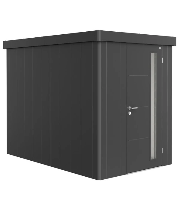 Das Biohort Gerätehaus Neo 3A ist mehr als gut. Es ist ein elegantes Design-Highlight. Dafür sorgen die hochwertig versiegelten Stahlblechwände, die einen sanften Glanz zeigen. In Kombination mit dem modernen Flachdach wird es schließlich zum trendstarken Kubus. Und die perfekt integrierte Tür zieht mit ihrem schmalen Lichtelement die Blicke auf sich. Gleichzeitig fügt es sich mit seinem geradlinigen Design und den sanft gerundeten Gebäudekanten harmonisch in jedes Gartenambiente ein.