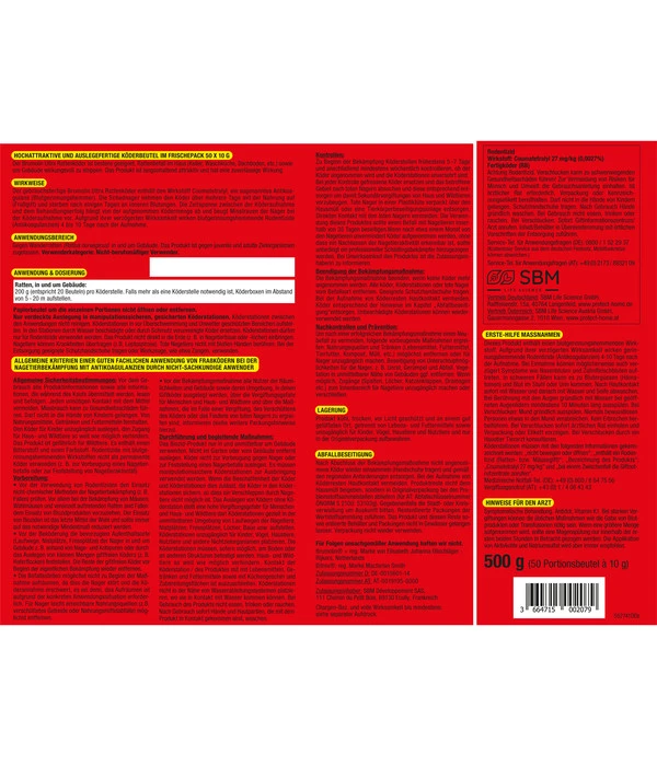 Dieser Wirkstoff wird seit Jahrzehnten mit Erfolg bei der Rattenbekämpfung eingesetzt. Es handelt sich dabei um einen Stoff, den die Tiere mit dem Fraßköder aufnehmen und der die Blutgerinnung verhindert, sodass die Schadnager wenige Tage später an inneren Blutungen sterben. Warum nicht sofort, fragen Sie? Weil Ratten enorm intelligente Tiere sind und „Vorkoster“ vorschicken, um eine neue Nahrungsquelle zu prüfen. Stirbt der „Vorkoster“, werden die übrigen Tiere diese Nahrung – und damit auch den Wirkstoff – nicht aufnehmen. Deshalb wirkt Brumolin® Ultra Rattenköder zeitversetzt, sodass Sie damit effektiv gegen die Ratten innerhalb und außerhalb des Hauses vorgehen können.