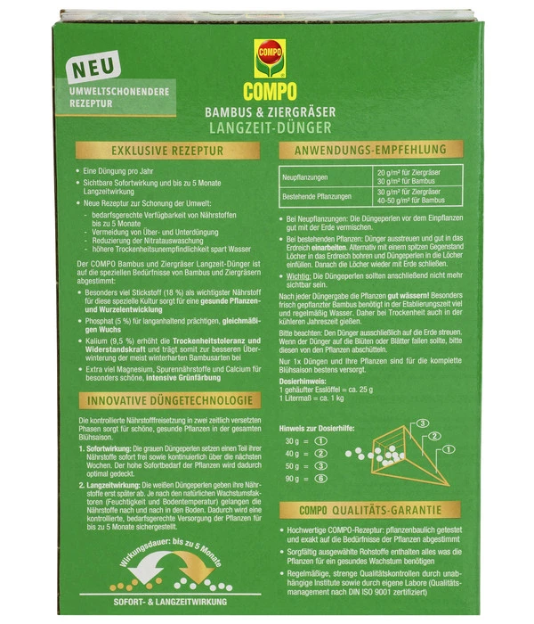 Sie möchten Ihren Garten, Ihren Balkon oder Ihre Wohnung mit strahlendem Grün auffrischen? Ihre Ziergräser sollen mit gesundem Aussehen und gutem Wachstum beeindrucken? Mit dem COMPO Bambus & Ziergräser Langzeit-Dünger haben Sie ein Pflanzenwuchsmittel, das nicht nur für kräftiges Wachstum, sondern auch für eine hohe Widerstandskraft Ihrer Pflanzen sorgt. Der Spezialdünger eignet sich hervorragend für die Bedürfnisse von Zier- und Kübelgräsern, wie Festuca-Arten, Pampas-, Pfeifen- oder Federborstengräsern, sowie von allen Bambusarten.