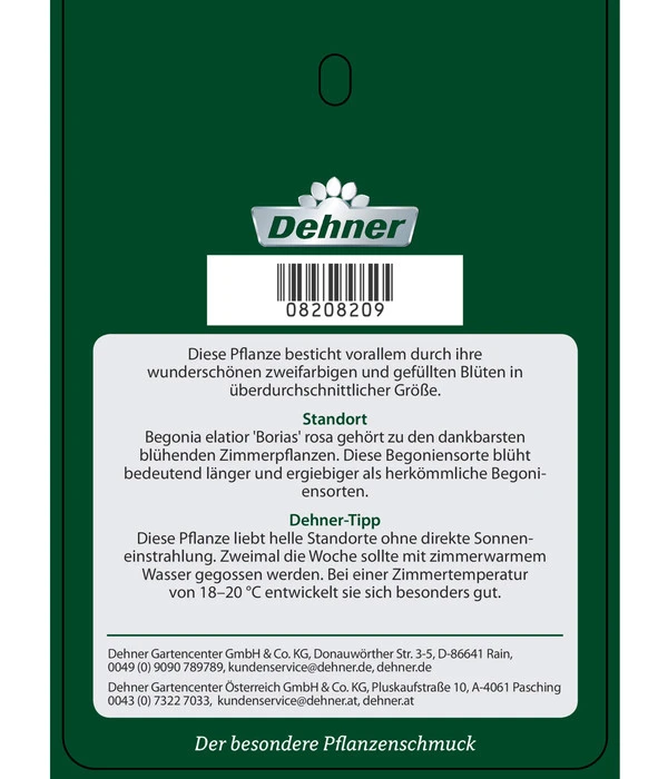 Eine der ältesten, bekanntesten und zugleich beliebtesten Zimmerpflanzen ist die Begonie, oftmals auch Zimmer- oder Blühbegonie genannt. Seit mehr als 100 Jahren ist sie bereits im Handel und erfreut uns und gewiss auch Sie mit immer neuen Züchtungen. Eine dieser Neuheiten, ist die Dehner Premium Elatior-Begonie ‚Borias‘. Mit dieser Sorte holen Sie sich eine besonders schöne Blühpflanze in die Wohnung, mit der Sie gezielt Farbakzente in Ihren Wohnräumen setzen und romantisches Flair verbreiten können. Die reichblühende Zimmerpflanze ist in zwei verschiedenen Farben erhältlich. Während die eine Pflanze gefüllte, tiefrote Blüten mit zartrosa Rand zeigt, erscheint die Andere in sinnlichem Rosé das ein rotes Herz in der Mitte trägt. Ein Anblick zum Verlieben – diese Pflanzen sind ein Muss für jeden Pflanzen-Liebhaber!