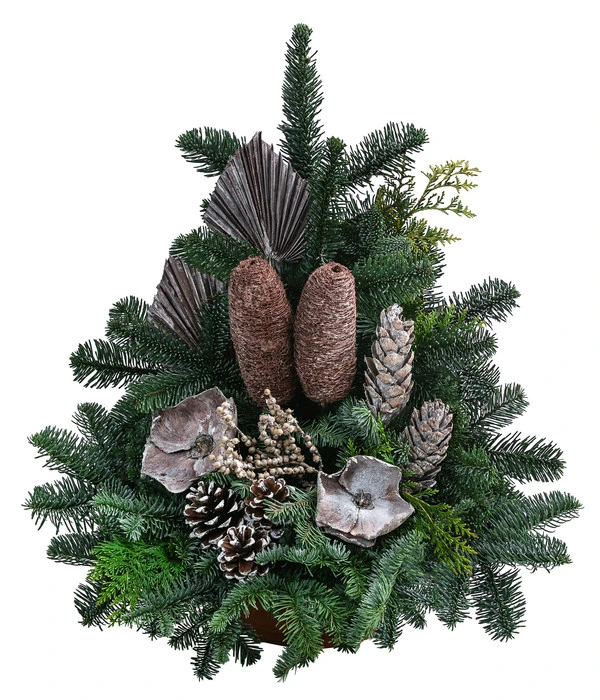 Bei diesem Grabgesteck bilden einige Zweige der Nobilistanne, die nicht ohne Grund als Edeltanne bezeichnet wird, die dunkelgrüne Basis für weitere natürliche Deko-Elemente. Da gesellen sich verschiedene Koniferenzweige in anderen Grünnuancen dazu, begleitet von Zapfen, die aussehen, als hätte der erste Schnee sie gerade frisch bezuckert. Den dekorativen Mittelpunkt aber bilden die exotischen Naturmaterialien wie die hübschen Palmwedel oder die exotischen Blüten- und Fruchtstände, die der Kreation die exklusive Note verleihen. Für einen stabilen Stand auf dem Grab sorgt die praktische Schale aus Terrakotta, in der das Gesteck kunstvoll arrangiert wurde. Noch ein Tipp: Bringen Sie mit einer Grablampe Licht in dunkle Winternächte. Bei Dehner finden Sie eine große Auswahl verschiedener Grablichter, auch eine LED-Grablampe, die eine kleine Solarzelle hat und die letzte Ruhestätte und das Grabgesteck bei Nacht mit einem warmen Lichtschein beleuchten wird.