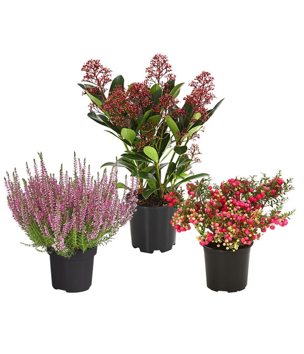 Sie besuchen gerne in aller Ruhe die letzte Ruhestätte Ihrer lieben Verstorbenen und wünschen sich dafür eine dekorative Bepflanzung. Schließlich zeigt man damit auch, wie viel einem der Mensch noch heute bedeutet und greift bewusst zu bestimmten Pflanzen oder Farben, weil derjenige sie gerne mochte. Ein wunderschöner Gedanke, den Sie mit einem Grabpflanzenset Achtungsvoll direkt in die Tat umsetzen können. Dieses Set enthält nicht nur drei wunderschöne, immergrüne Pflanzen, von denen sich jede mit einem farbigen Schmuck in unterschiedlichen Rottönen präsentiert. Sondern die Pflanzen wurden bewusst in unterschiedlichen Größen zusammengestellt. So können Sie sowohl in puncto Farbe als auch in puncto Größe individuell gestalten. Setzen Sie die größere Pflanze in den Hintergrund und die kleineren davor, entsteht ein attraktiv gestuftes Ensemble, bei dem die dunkelroten Blütenknospen der Skimmie ‚Rubella‘ sich über die rosafarbenen Blüten der Knospenheide erheben und an deren Fuß die Beerenfülle der Torfmyrte alle Blicke auf sich zieht. Ein Anblick, der Ihnen gefallen würde? Dann greifen Sie zum Grabpflanzenset Achtungsvoll!