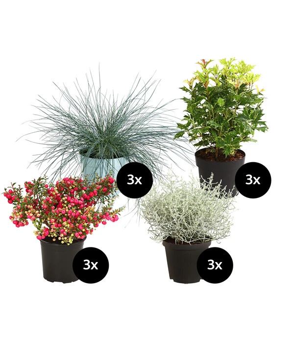 Ein liebevoll bepflanztes Grab ist für Sie eine Herzensbotschaft an die Verstorbenen. Dann wird es Ihnen ein tröstendes Anliegen sein, Ihre verstorbenen Lieben am Wechsel der Jahreszeiten teilnehmen zu lassen. Für die Herbst-Saison haben wir deshalb das Grabpflanzenset Trost für Sie zusammengestellt. Es bietet mit 12 Pflanzen viele Möglichkeiten und enthält je 3 Blauschwingel ‚Intense Blue‘, 3 Gitterkraut, 3 Stachelblättrige Duftblüten und 3 Torfmyrten. Das heißt, Sie können hier ganz nach Ihrem Geschmack gestalten. Entscheiden Sie, ob Sie die unterschiedlichen Pflanzen in Gruppen oder lieber im Mix einsetzen. Als extravaganter Blickfang fungiert hier sicherlich die Stachelblättrige Duftblüte, die mit ihrem Blattschmuck in verschiedenen Grünnuancen auf sich aufmerksam macht, aber natürlich auch die Torfmyrte, die mit pinkfarbigen Beeren Farbe ins Arrangement bringt. Dazwischen wirken der zarte Blauschwingel und das filigrane Gitterkraut als strukturgebende und auflockernde Elemente und schaffen so ein abwechslungsreiches und vor allem dekoratives Gesamtbild. Verleihen Sie der letzten Ruhestätte Ihrer Lieben mit dem Grabpflanzenset Trost ein dekoratives Herbstkleid!