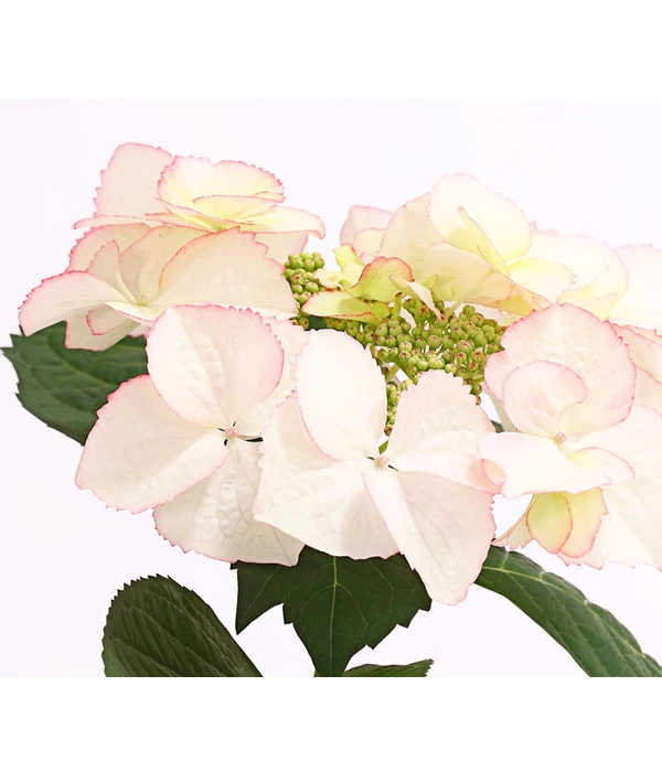 Von weitem wirken die prachtvollen Blütenstände strahlend weiß, doch von Nahem werden Sie entdecken, dass sie elegant cremeweiß sind und dass jedes einzelne Blütenblättchen mit einem rosafarbenen Rand verziert ist. Ein Anblick, der Ihnen jedes Jahr das Herz aufgehen lassen wird, wenn sich die Hortensie ‘Love You Kiss‘ in voller Schönheit präsentiert. Und das romantische Flair, das die Hortensie ‘Love You Kiss‘ zugleich ausstrahlt, gibt glücklicherweise nicht nur ein kurzes Gastspiel, sondern dauert von Juli bis Oktober. Wofür diese Bauern-Hortensie ein kleines Küsschen verdient hätte! Die Blütenpracht der Hortensie entfaltet sich an einem breiten, dichtbuschigen Strauch, der nur eine Höhe von 100 – 150 cm erreichen wird, so dass Sie auch in Ihrem Garten noch ein Plätzchen für diese Blüten-Schönheit finden sollten. Schenken Sie sich und Ihrem Garten ein bisschen Romantik – mit der Hortensie ‘Love You Kiss‘!