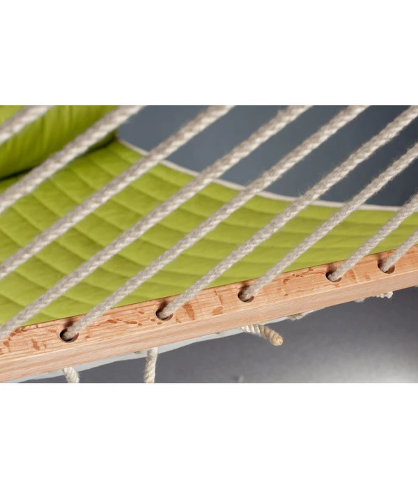 Bei passionierten Sonnenanbetern ist eine Stabhängematte besonders beliebt, da der Spreizstab die Liegefläche immer spannt und offen hält, so dass kein Schattenwurf entstehen kann. Wenn diese Hängemattenfans aber dann das Modell Kingsize Alabama entdeckten, wird ihre Begeisterung keine Grenzen mehr kennen. Denn die Stabhängematte Kingsize Alabama lockt nicht mit karibischem Flair, sondern verspricht großzügiges Entspannen im nordamerikanischen Stil. Und das heißt: die Liegefläche hat eine Breite von 140 cm und ist komfortabel gepolstert. Das sorgt für den besonderen Liegegenuss und schützt gleichzeitig vor Auskühlung, wenn zum Beispiel im Frühjahr die Sonne schon wunderbar wärmt, es im Schatten – also die Luft unter der Stabhängematte Kingsize Alabama – noch unangenehm kalt ist. Das Kissen ist übrigens abnehmbar.