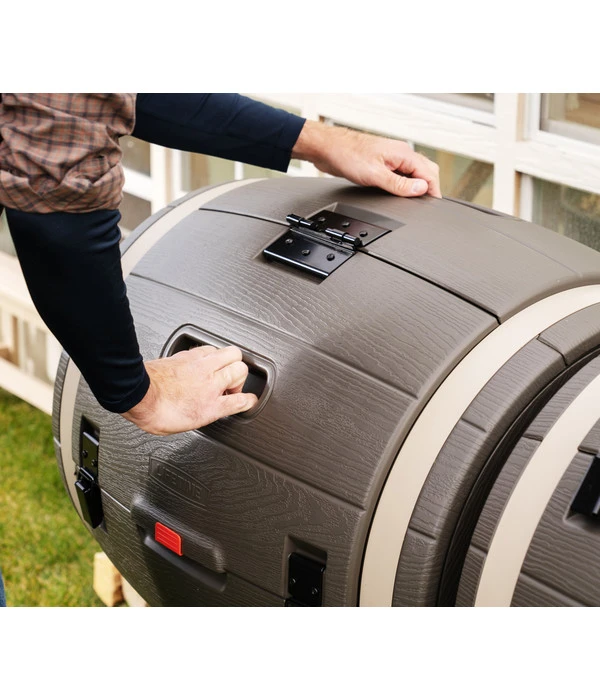 Dank der ausgeklügelten Technik mit gelegentlichem Drehen der Kunststofftrommeln wird das Kompostgut gelockert und perfekt verteilt. Die zwischen den Wänden eingeschlossene Luft sorgt für eine effektive Isolierung und schafft beste Voraussetzungen für einen intensiven Verrottungsvorgang. Eine genaue Kompostieranleitung wird Ihnen mitgeliefert, sodass Sie direkt loslegen können. Besonders vorteilhaft: die Trommel ist dank der bequemen Arbeitshöhe und großen Öffnungsklappe leicht zu befüllen und rückenschonend. Ferner schützt das robuste Stahlgestell optimal vor Nagetieren und sorgt für einen sicheren Stand. Die wetterfeste und UV-beständige Ausführung aus recycelbarem Kunststoff macht den Trommelkomposter zu einem langlebigen Begleiter in Ihrem Garten. Überzeugen Sie sich selbst und bestellen Sie jetzt Ihren Trommelkomposter von Lifetime!