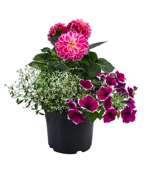 Bei einem Dreiergespann kann man nie ganz sicher sein, wie sich die einzelnen Mitglieder verstehen. Aber hier herrscht, das sieht man auf den ersten Blick, vollkommene Harmonie. Denn jede der drei Blattschönheiten in dem Pflanzen-Trio Sommerlaune legt sich voll ins Zeug, um mit allen ihr zur Verfügung stehenden Mitteln zum Erfolg beizutragen. Da ist die hübsche Hängepetunie, der es mühelos gelingt, den ganzen Sommer ihre strahlend lila-weißen Blüten zu zeigen, während die leicht hängende Wuchsform dem Potpourri den romantischen Touch verleiht. Da ist die stolze Dahlie, die ohne Zweifel der Star unter den drei ist, denn sie präsentiert an aufrechten Stängeln kräftig pinkfarbene Blütenbälle, die der Blickfang des Trios sind. Der eher zierliche Zauberschnee hat mit seinen grazilen weißen Blüten im ersten Moment Mühe, mit den beiden farbenfrohen Blühpflanzen mitzuhalten, doch ohne dieses kleine Blütenwunder würde eindeutig etwas fehlen. Lassen Sie sich in diesem Sommer von dem Blütenkonzert unterhalten, das das Pflanzen-Trio Sommerlaune bei Ihnen von Mai bis Oktober anstimmt.