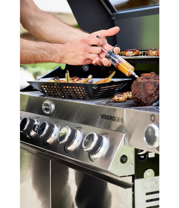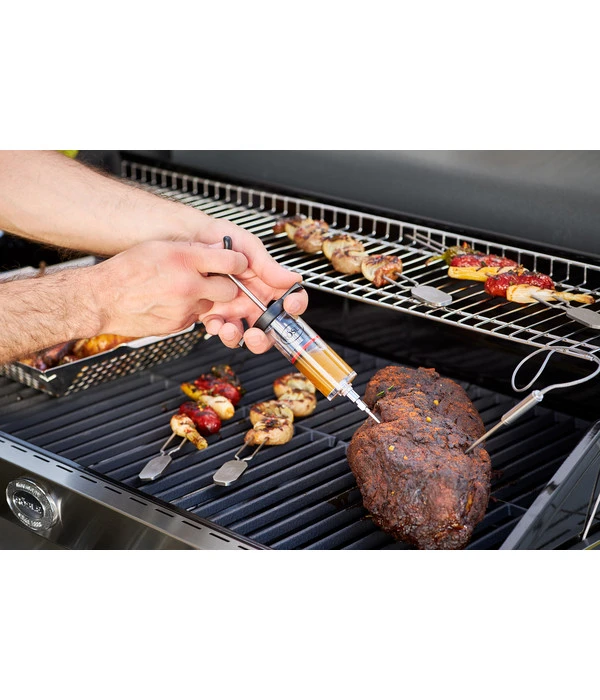 In den meisten Fällen kauft man bereits mariniertes Fleisch, doch der eigene Geschmack und die Vorlieben werden dabei nie so genau getroffen. Doch das eigene Marinieren hat bei Ihnen bisher auch nicht perfekt geklappt? Mit der Marinierspritze von Rösler handelt es sich um praktisches Zubehör für den Grill. Sie können durch direktes Marinieren mithilfe des Einführens einer Spritze in das Fleisch ein einmalig gutes Ergebnis erzielen. Die Zeit, in der Sie marinieren ist kurz, doch der Geschmack ist umso intensiver und es entsteht ein Geschmackserlebnis. Probieren Sie beliebig viele Rezepte aus und testen Sie, welche Mischungen von Gewürzen und Öl am besten zu den verschiedenen Fleischsorten passen. Die Nadel sowie der Schnellverschluss lassen sich im Handumdrehen abnehmen. So haben Sie keinen besonders großen Aufwand bei der Nachbereitung Ihres Grillfestes mit der Familie oder Freunden. Dadurch, dass sie spülmaschinenfest ist, haben Sie noch weniger Arbeit.