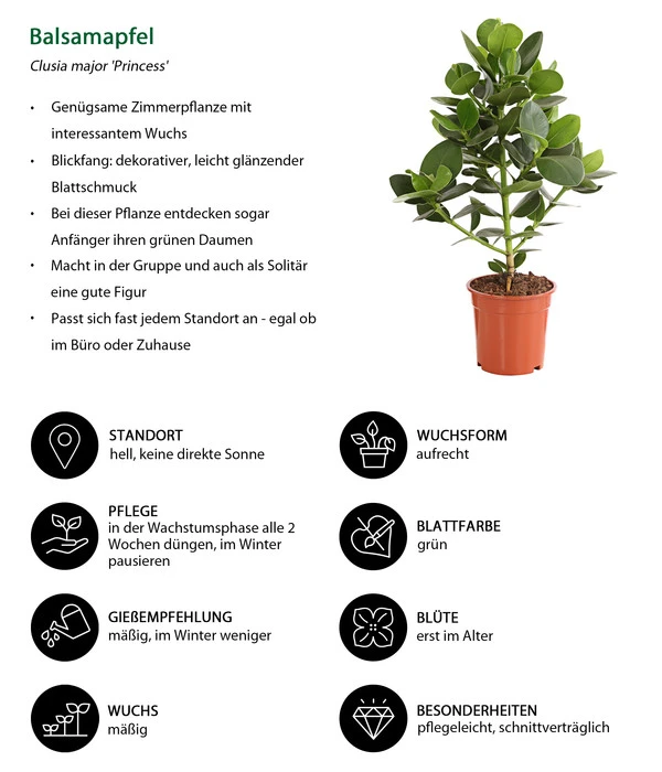 Als robust und pflegeleicht beschreiben Grünpflanzenkenner die Clusia. Am besten gedeiht die Pflanze an einem warmen, hellen Standort ohne direkte Sonneneinstrahlung. Entsprechend der tropischen Herkunft mag es ein Rosafarbener Balsamapfel gerne warm, oder anders ausgedrückt, der Standort des Balsamapfels sollte nie kälter als 16°C werden. Gießen Sie regelmäßig, aber nicht zu viel. Zwischen den Gießintervallen darf die Erde ruhig etwas antrocknen. Sehr dankbar ist die Grünpflanze auch für ein regelmäßiges Besprühen mit kalkfreiem Wasser. Und ab und zu sollten Sie zur Schere greifen, denn ein regelmäßiger Rückschnitt sorgt für eine schöne Verzweigung. Als Substrat ist zum Beispiel die Dehner Blumenerde zu empfehlen, bei Bedarf mit etwas Tongranulat gemischt.