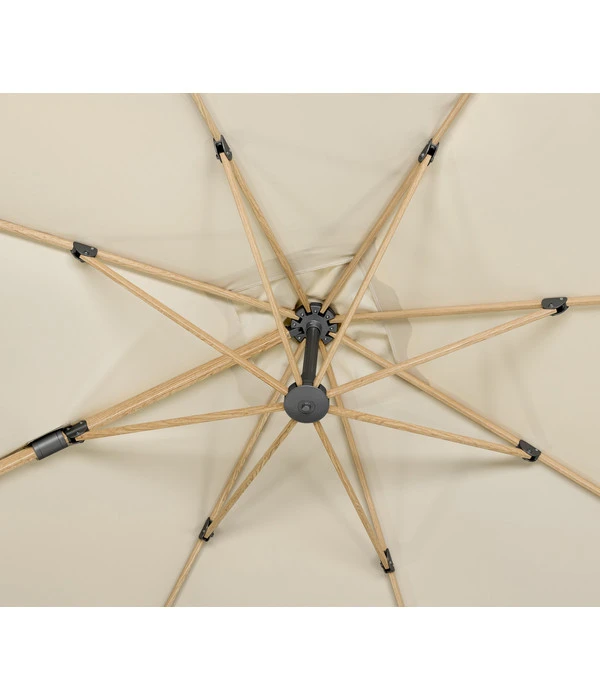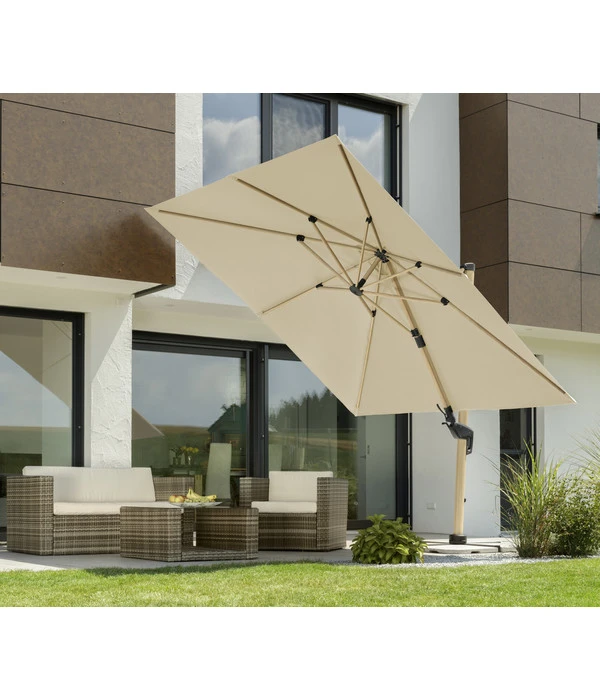 Ein Schirm in Ampelform hat enorme Vorteile, denn darunter können Sie Ihre Sitzgruppe oder Ihre Loungegruppe nach Ihren Wünschen arrangieren, da sich der Holm außerhalb der Schirmfläche befindet. Dass sich der Schneider Ampelschirm Rhodos Twist Woody mittels Fußpedal bequem um 360° drehen lässt, entlang des Mastes um 80° und entlang des Auslegearms um bis zu 45° zu neigen ist, eröffnet Ihnen unzählige Möglichkeiten des Schattenwurfs – je nach Wunsch und Sonnenstand. Geöffnet und geschlossen wird er bequem mittels der praktischen Kurbel.