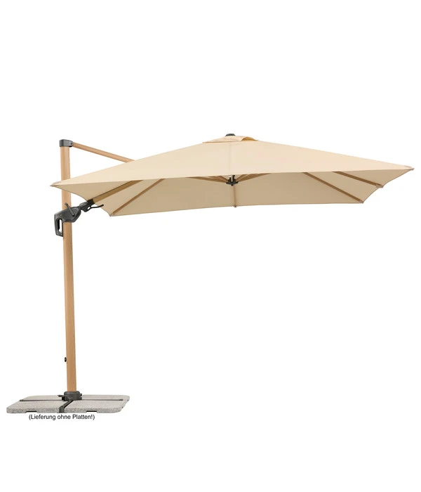 Verlassen Sie sich beim Schneider Ampelschirm Rhodos Twist Woody auf eine wasserabweisend imprägnierte Polyesterbespannung, die einen UV-Schutz von 50+ bietet und mit einem Stoffgewicht von 200 g/m² genau so robust ist, den Witterungen problemlos zu widerstehen und gleichzeitig so leicht, dass Sie den Bezug abnehmen und bei Bedarf per Handwäsche reinigen können. Sie erhalten den Schirm inklusive Schutzhülle und Plattenständer, den Sie mit 50 x 50 cm Wegplatten beschweren können.