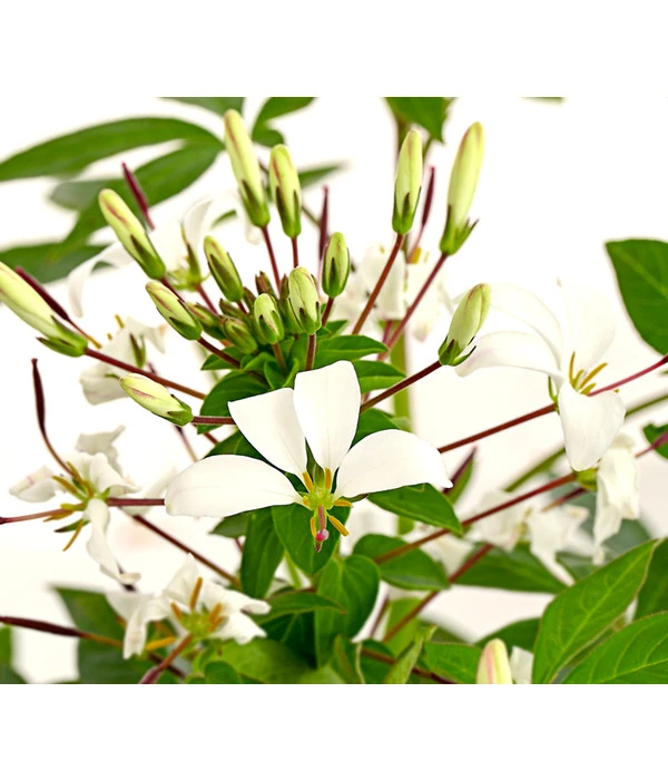 Setzen Sie in Ihrem Blumengarten auf die Spinnenpflanze ‚Weiß‘, die mit botanischem Namen auch Cleome heißt. Die Pflanze begeistert schon ab Mai mit aparten, spinnenartigen Blüten in strahlendem Weiß, die aus lang gestielten Blüten- und Staubblättern bestehen. Blüten-Kunstwerke, die bis in den Oktober hinein als krönender Schmuck über dem dunkelgrünen Laubwerk zu bewundern sind. Genau deshalb zählt die Cleome wohl auch zu den beliebtesten Gartenpflanzen. Dank ihrer unermüdlichen Blühfreude trägt die Spinnenpflanze ‚Weiß‘ bis zu den ersten Frösten stolz ihren filigranen Blütenschmuck. Die Pflanze wächst aufrecht, buschig und gut verzweigt. Mit einer Höhe von bis zu einem Meter ist die Cleome eine beeindruckende Erscheinung, die alle Blicke auf sich zieht.