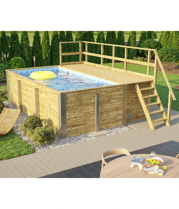 Sie mögen es, sich an den heißen Tagen im Jahr regelmäßig eine Erfrischung zu genehmigen? Gönnen Sie sich und Ihren Lieben den Massivholzpool von Weka und erleben Sie Ihren Garten auf eine völlig neue Art und Weise. Verwandeln Sie damit Ihre Außenanlagen in eine Spaß bringende Wasserwelt! Das Design dieses rechteckigen Beckens wirkt zeitgemäß und wunderbar aufgeräumt. Da das Kiefernholz dieses Modells kesseldruckimprägniert ist, weist es einen guten Schutz vor Witterungseinflüssen auf. Metalleckverbindungen und Metallstützen verleihen dem Becken ein hohes Maß an Stabilität. So haben Sie lange Freude an Ihrem Weka Massivholzpool.